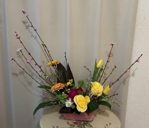 桃の枝がのびやかに空間を描き、菜の花のやわらかな黄色が春の光を思わせ、薔薇やチューリップがふっくらとした存在感で彩りを添えています。